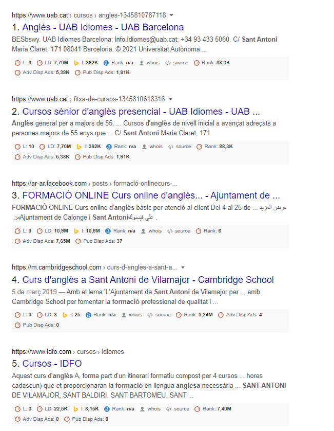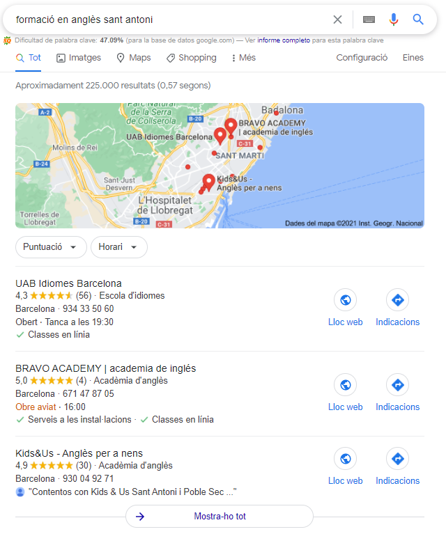 Si hacemos una búsqueda con una keyword long tail, por ejemplo, “academia de ingles para niños en sant antoni barcelona”, primero nos aparecerá el Google Snack Pack. El cuadro Snack Pack muestra los 3 principales listados de empresas locales más relevantes para la consulta de búsqueda.